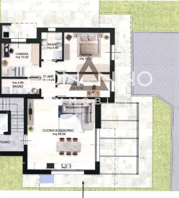 L’immobile è composto da soggiorno/cucina di 40 mq con affaccio sulla loggia coperta che da sul giardino privato di 250 mq.