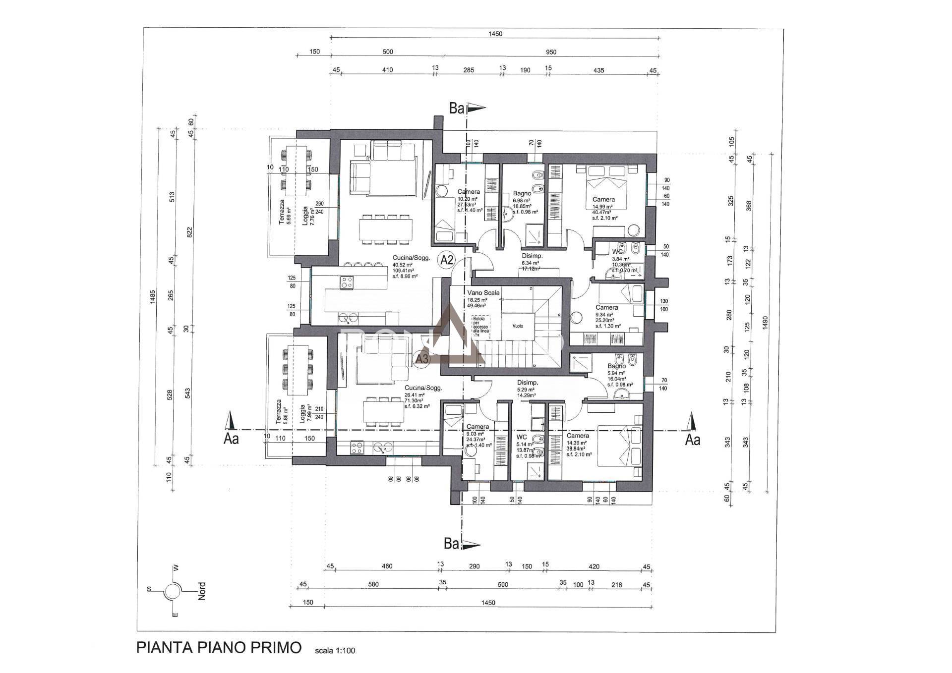 L’appartamento contrassegnato in planimetria con il codice A2 è così composto: cucina-soggiorno di oltre 40 mq con affaccio su terrazzo di 14 mq con loggia di 7 mq dove poter pranzare in comodità, disimpegno di 6,34 mq, camera di 10 mq, bagno di 7 mq, camera di 9,34 mq bagno di 4 mq e camera matrimoniale di 15 mq.