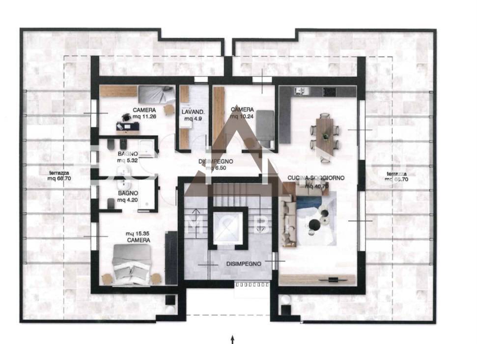 L’immobile è composto da soggiorno/cucina di 40 mq con affaccio sulla terrazza privata di 137 mq che circonda l’immobile .