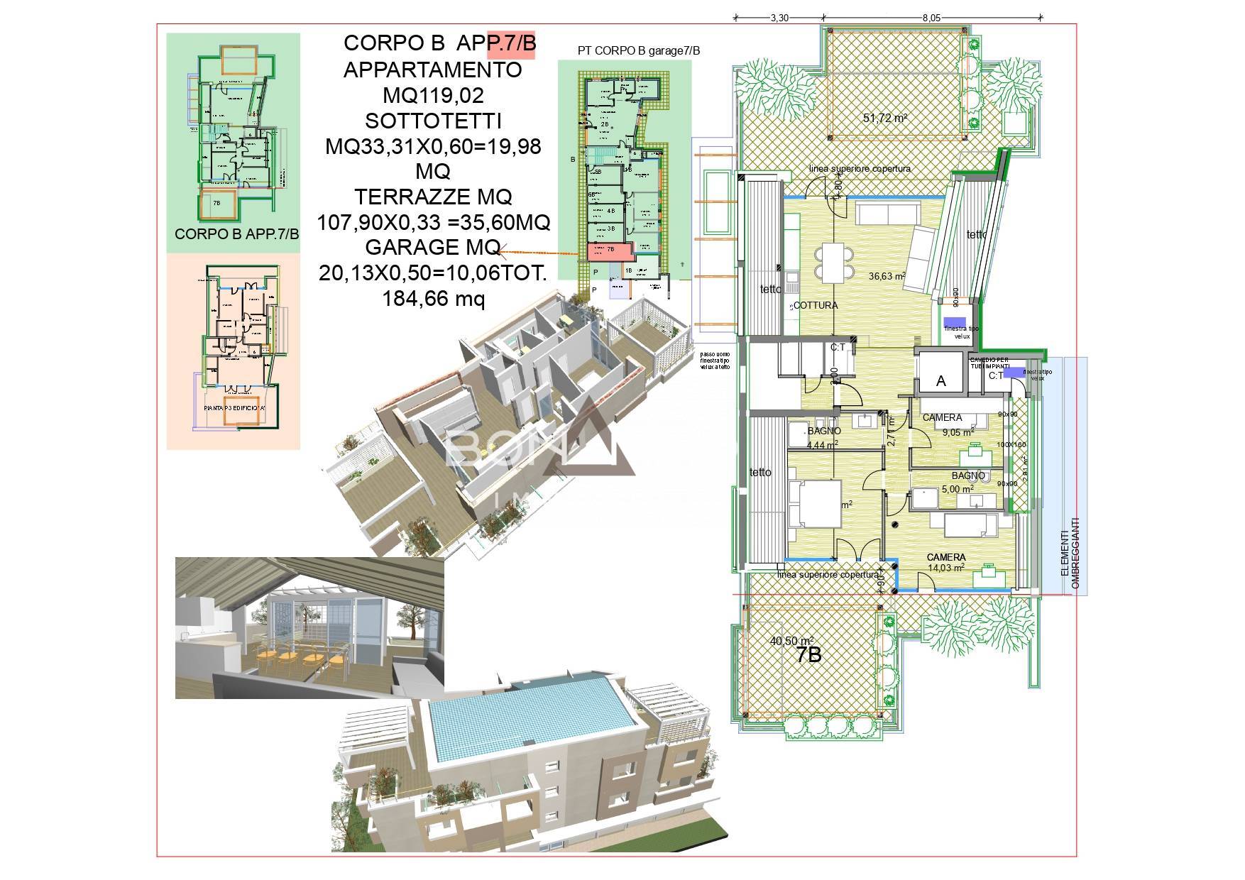 L’immobile si compone di ingresso su ampio e luminoso soggiorno con cucina open-space con accesso al terrazzo di circa 52 mq, disimpegno, due bagni finestrati, centrale termica, due camere matrimoniali e camera singola.