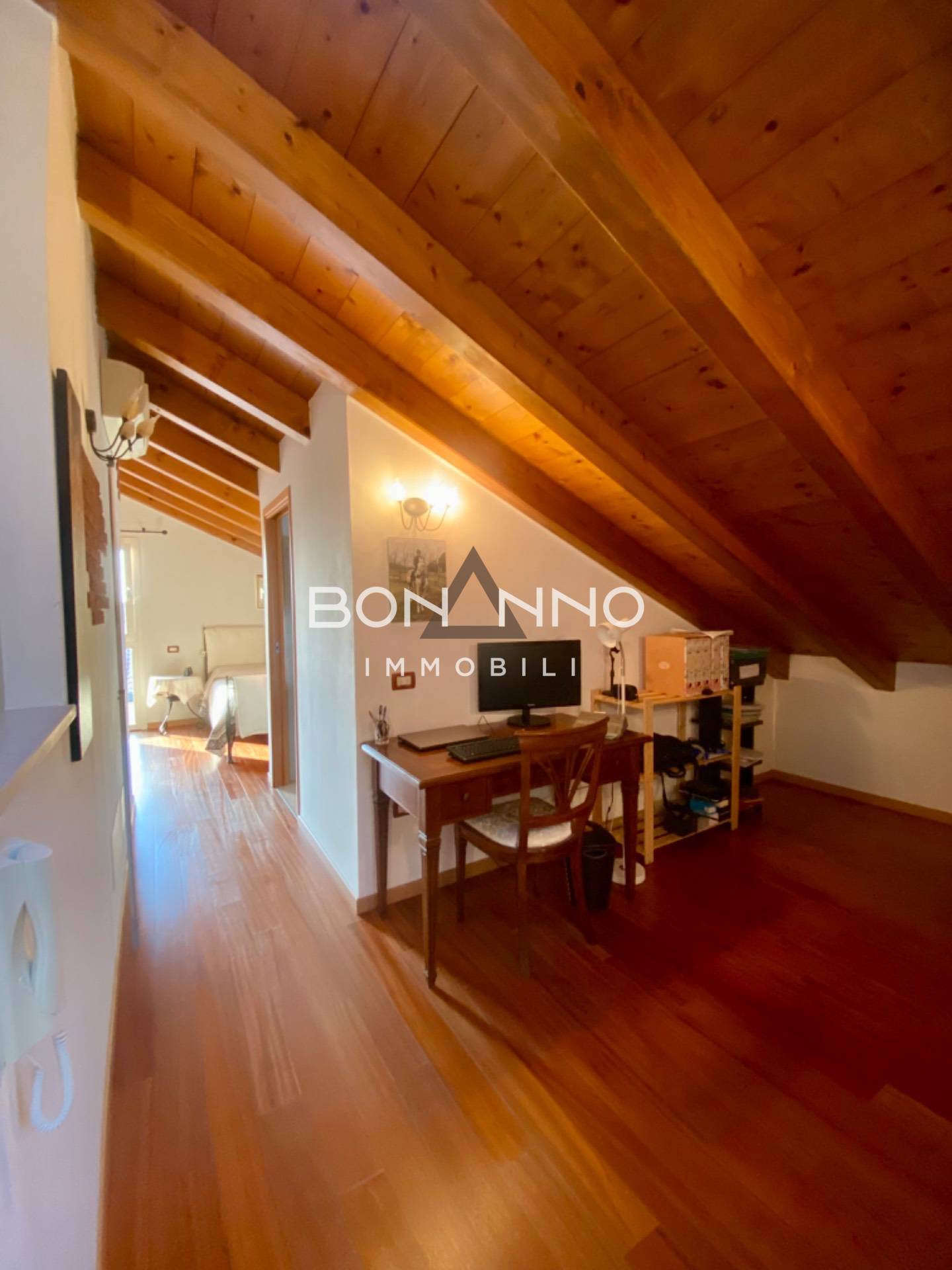Al Secondo piano veniamo accolti da uno studio/ sala svago, il bagno con poggiolo riservato ed infine un elegante camera matrimoniale e una cabina armadio( Parquet e travature in legno a vista).