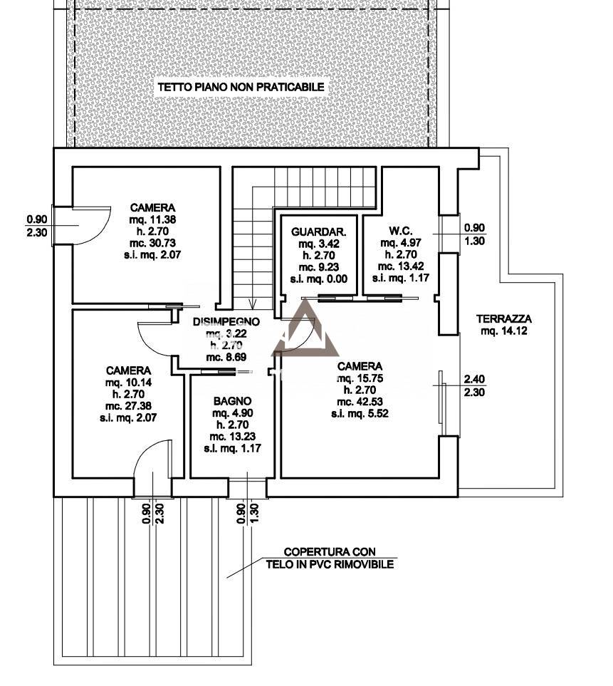 Salendo le scale raggiungiamo la zona notte dove troviamo una camera matrimoniale completa di guardaroba, bagno privato ed accesso diretto ad una terrazza di 14 mq. Troviamo inoltre una camera doppia, una camera singola ed un bagno.