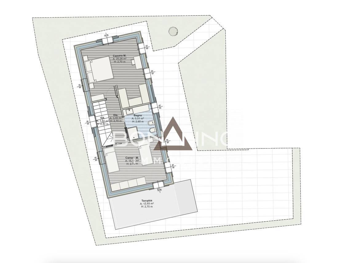 Salendo le scale troviamo una camera matrimoniale comunicante con un terrazzo di 9 mq e due camere singole.