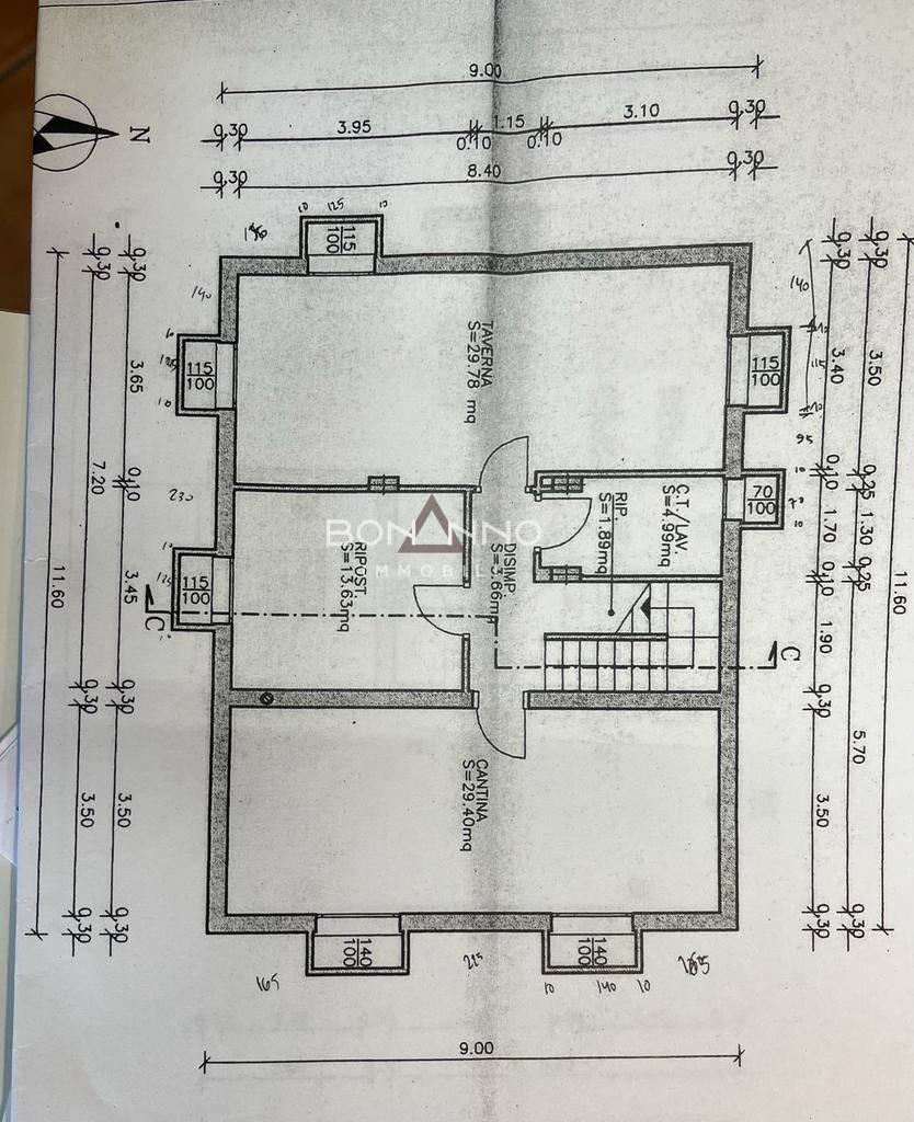 PIANO SEMINTERRATO: ripostiglio, taverna di 30 mq, cantina di 30 mq e lavanderia.