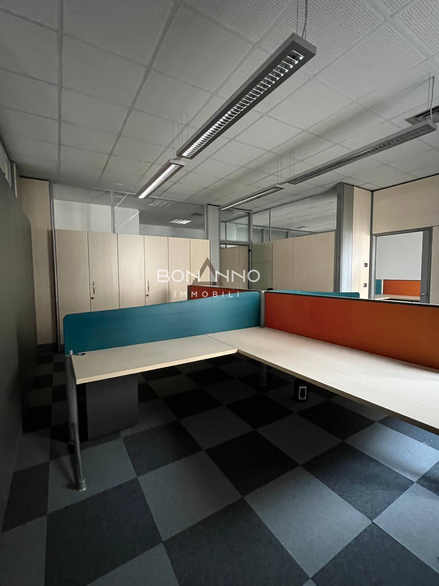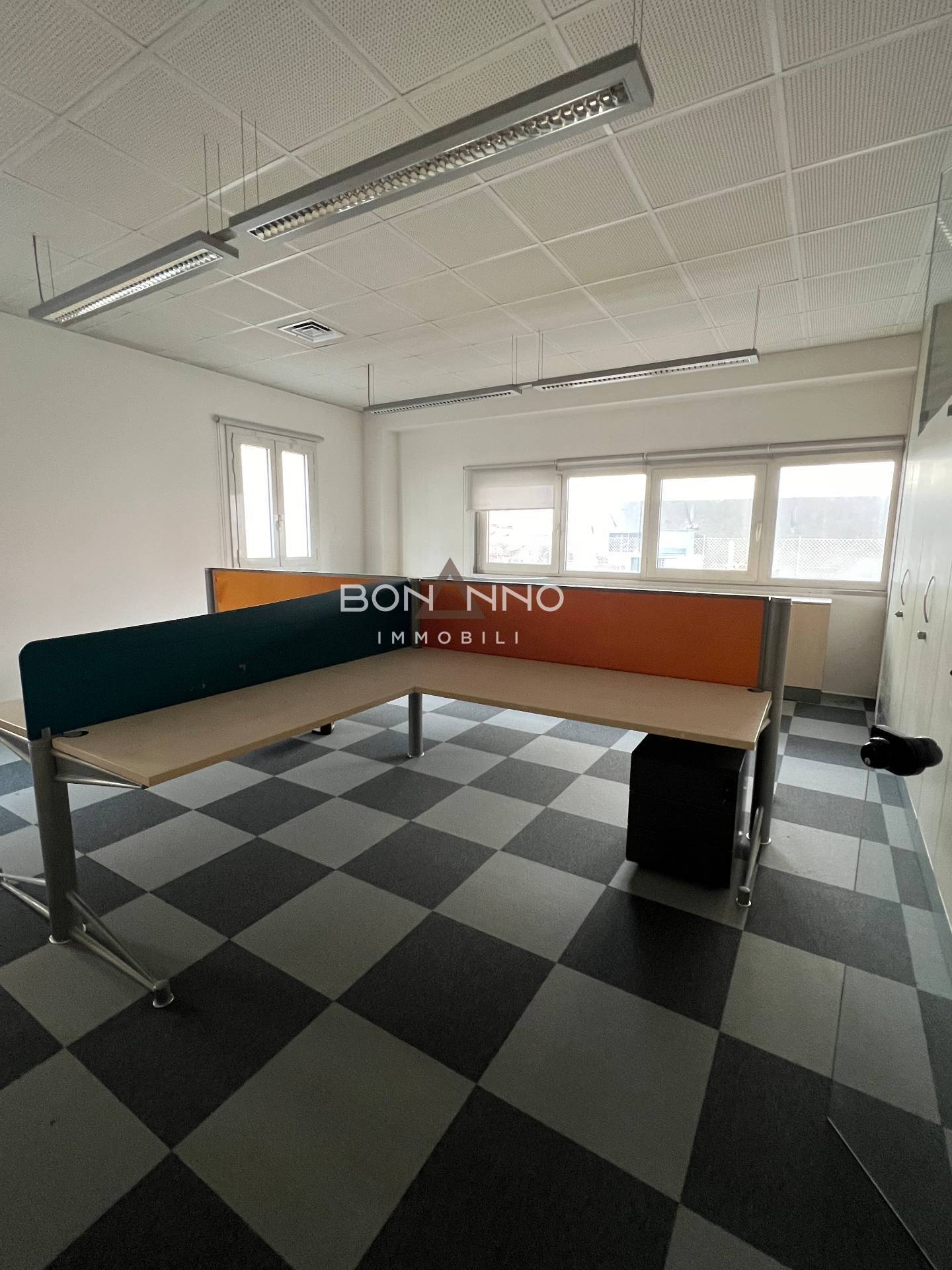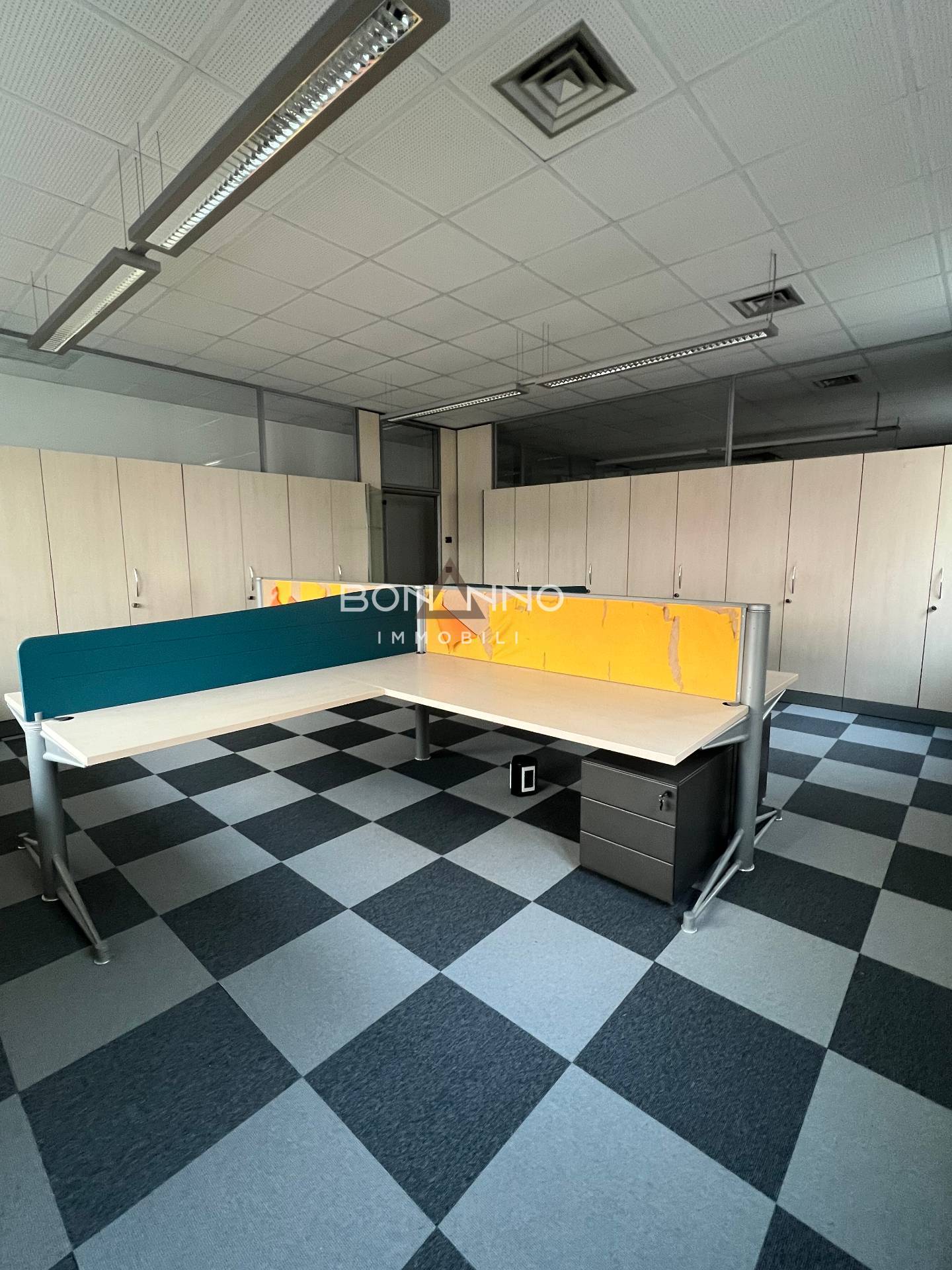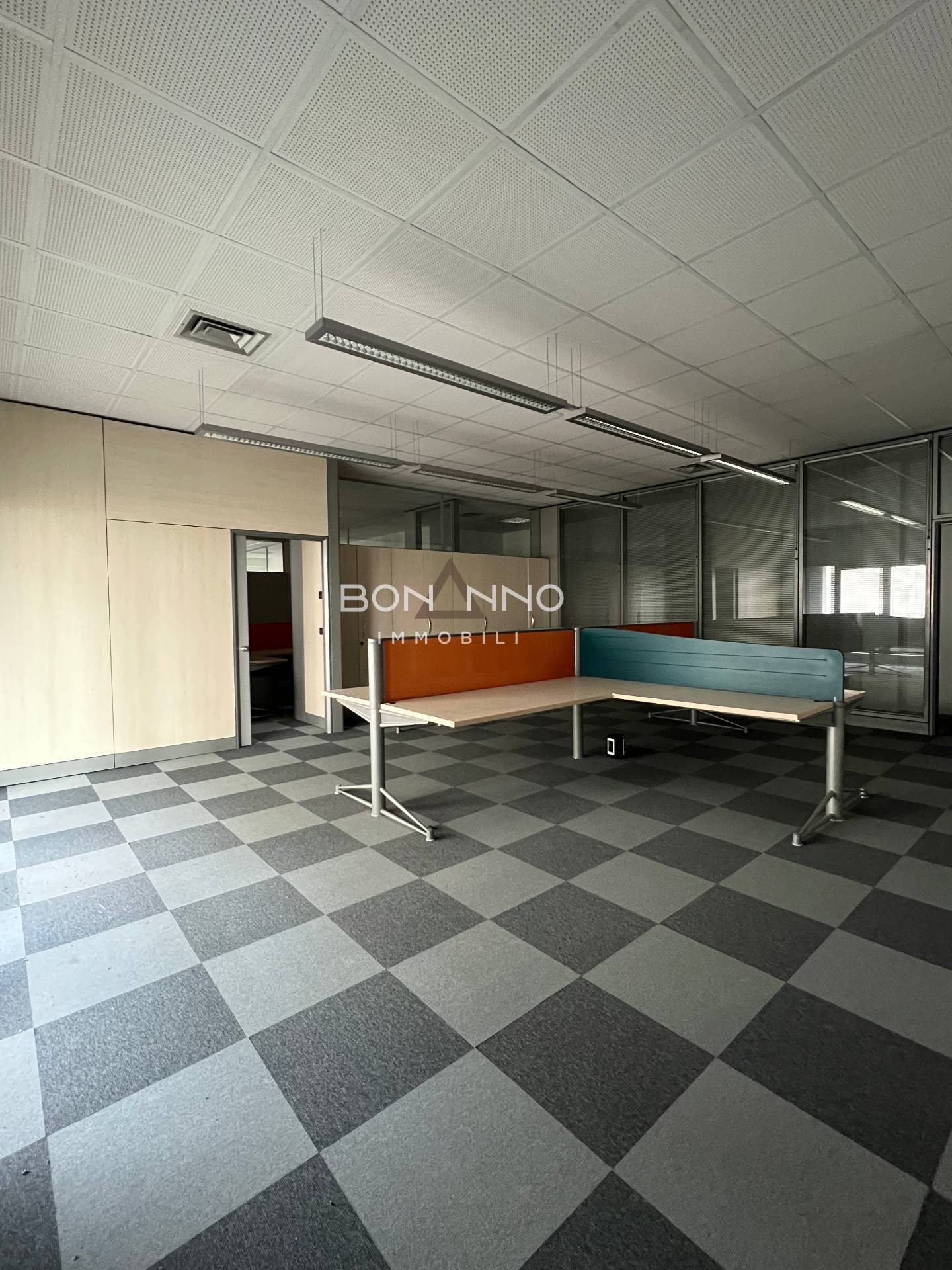 L’ufficio di 200 mq è diviso tramite mobilio e sono stati ricavati anche due uffici interni tramite vetrate classiche degli uffici direzionali bancari.