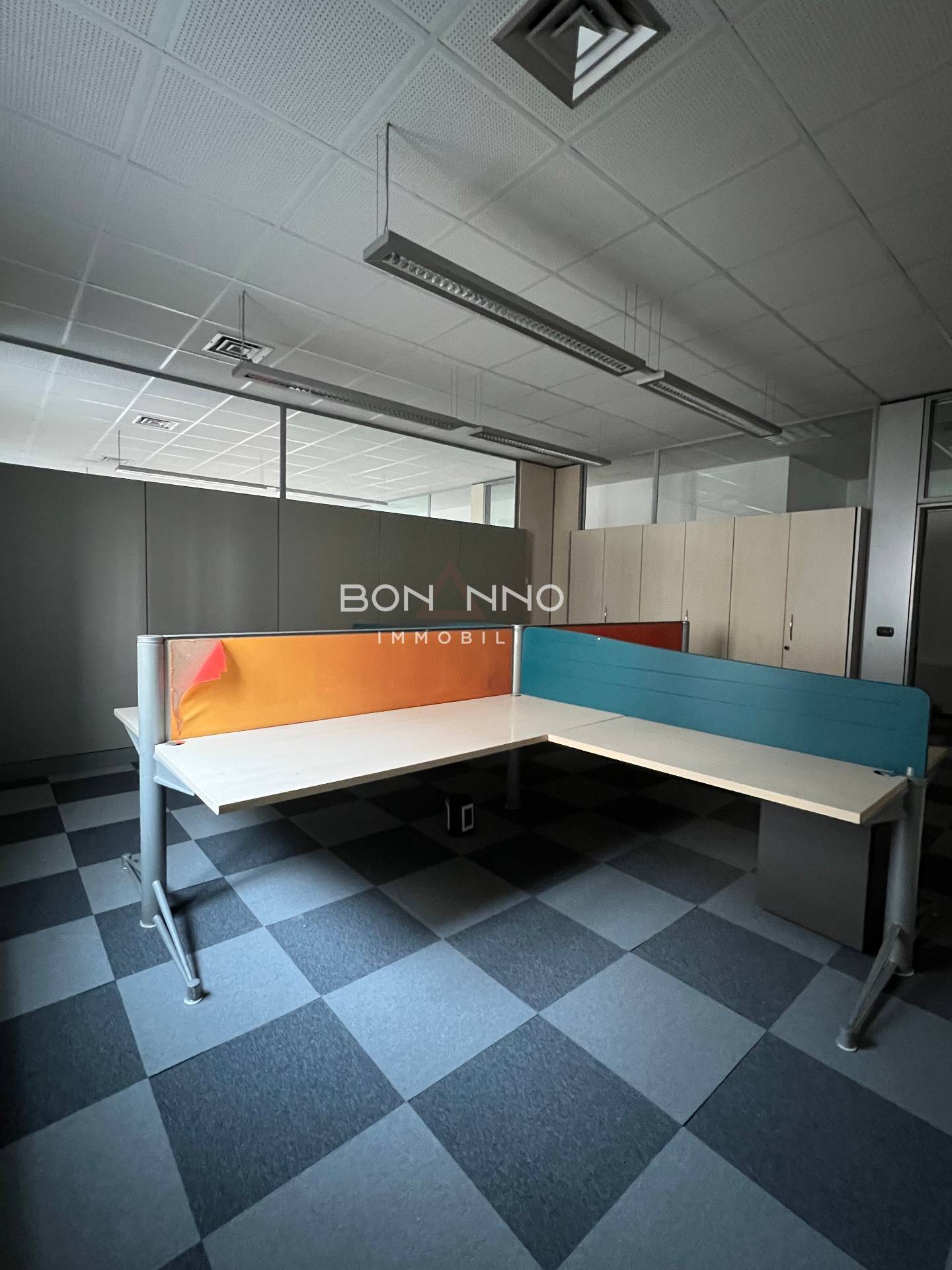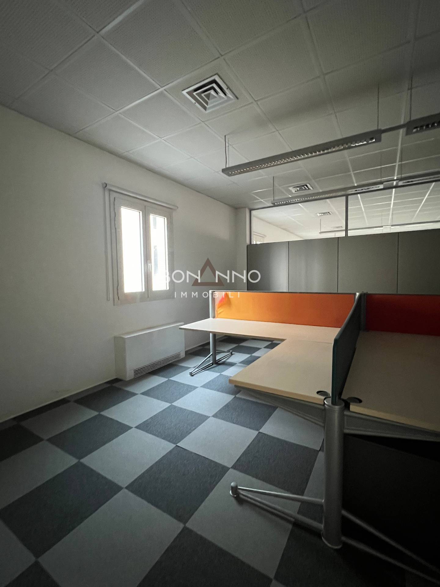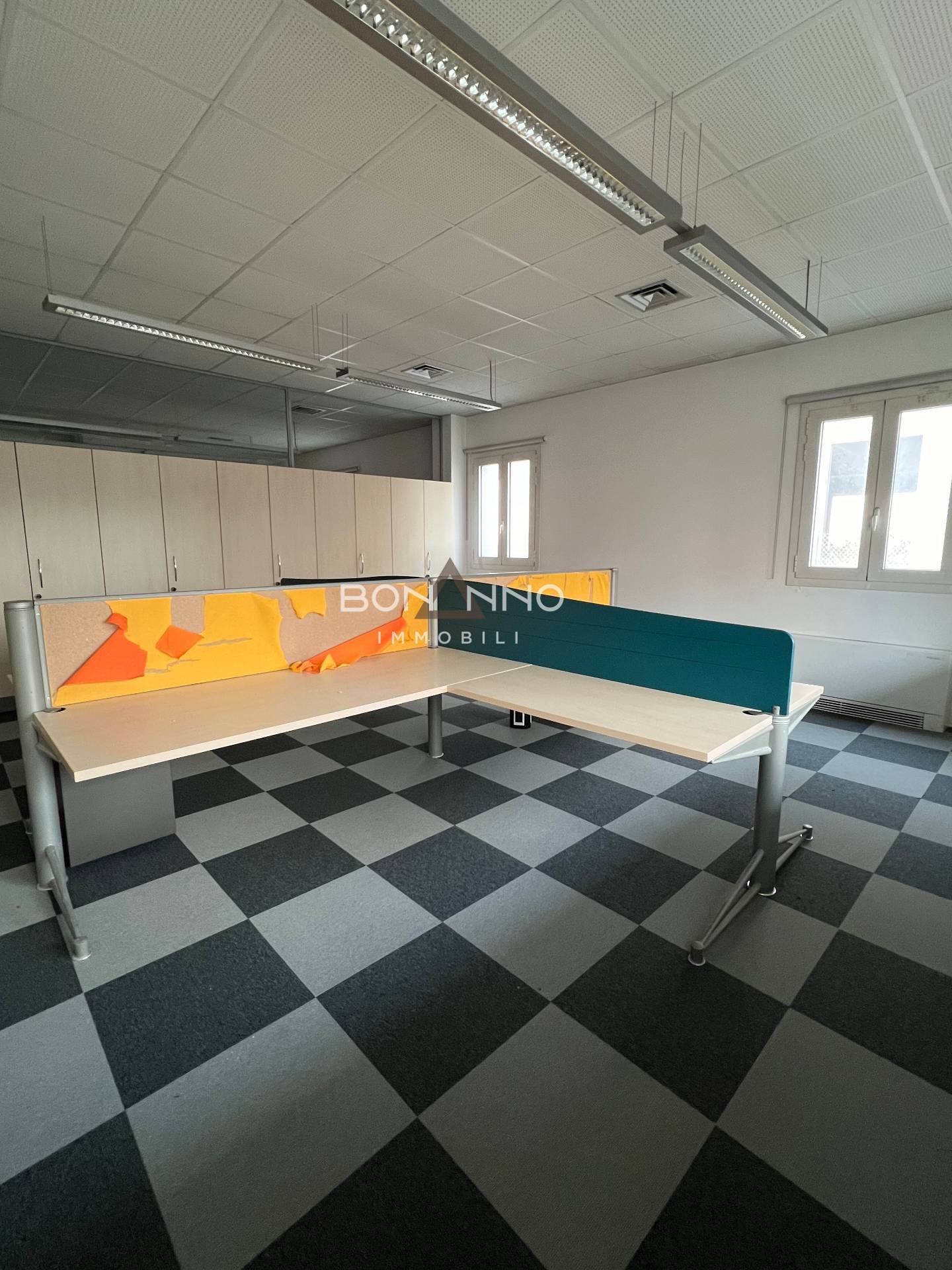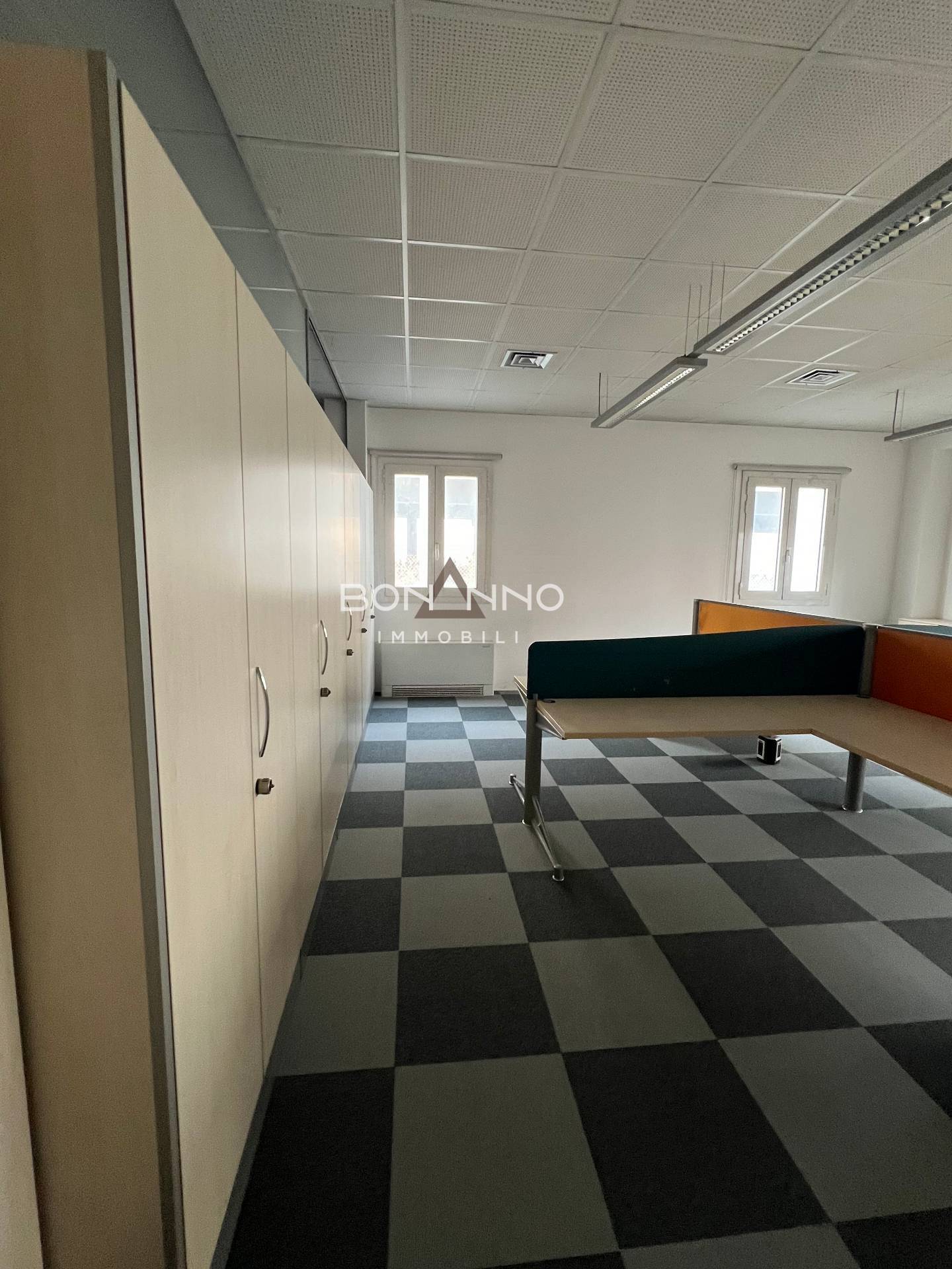 L’ufficio di 200 mq è diviso tramite mobilio e sono stati ricavati anche due uffici interni tramite vetrate classiche degli uffici direzionali bancari.