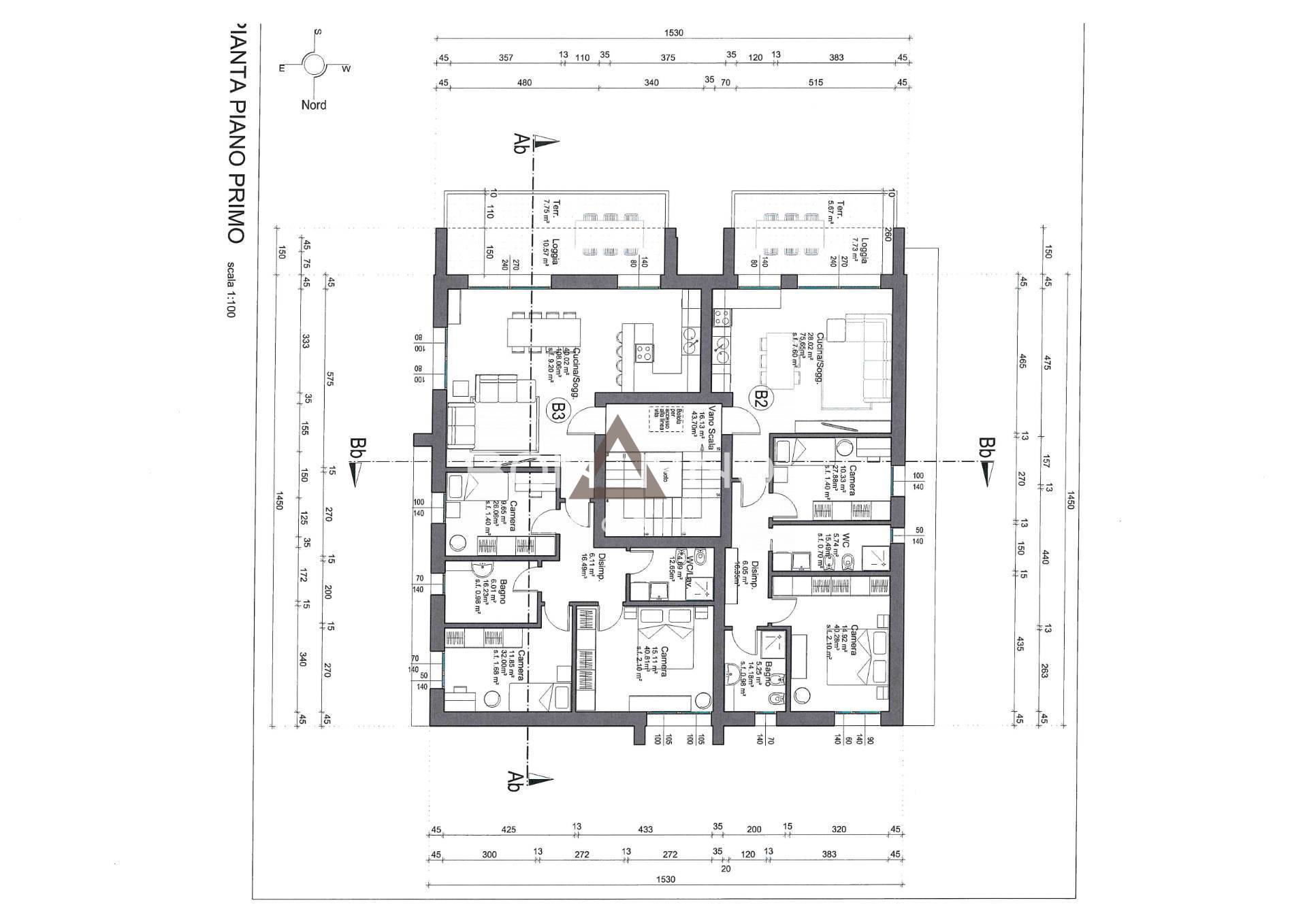 The apartment marked on the plan with the code B3 is composed as follows: Kitchen-living room of over 40 m2 overlooking a terrace of 18 m2 with a loggia of 10.57 m2 where the whole family can have lunch in comfort, hallway of 6.11 m2 , bedroom of 9.65 m2, bathroom of 6 m2, bedroom of 11.85 m2, bathroom of 4.89 m2 and double bedroom of 15.11 m2, the apartment will be equipped with all the comforts that a classy house offers today A4, on the ground floor double garage of 26.50 m2 and external parking space.