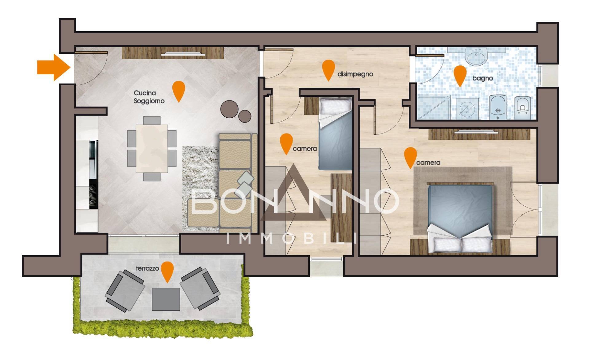 The apartment located on the 1st floor, served by a lift, consists of an entrance hall, a large and bright living room with an open-space kitchen, a double bedroom, a single bedroom, a bathroom with window and a 9 m2 habitable terrace where you can spend excellent moments in company.