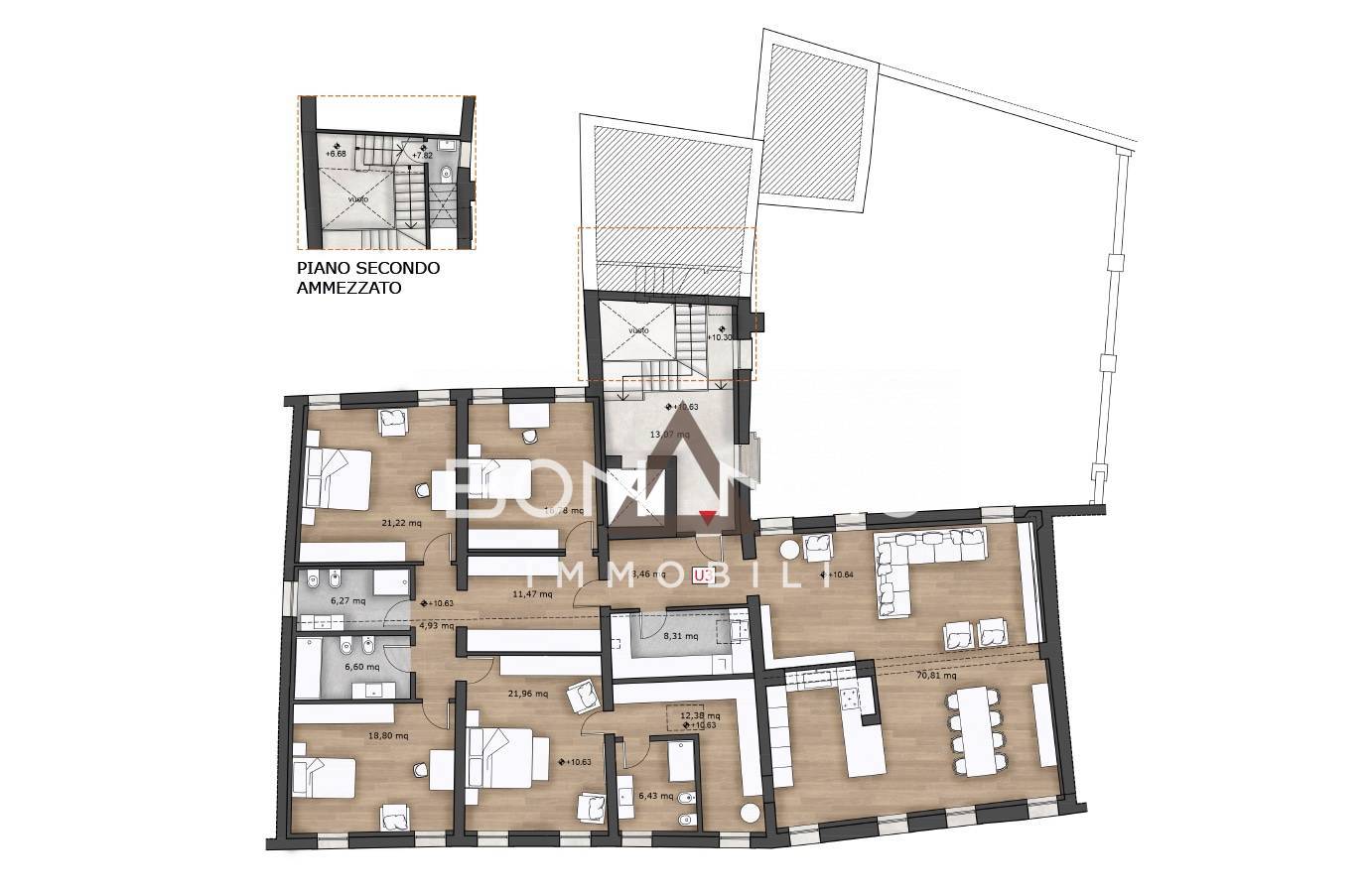 The space is completed by the large condominium garage, which houses the three private garages, with independent access, and a lovely internal garden, with three additional external parking spaces.