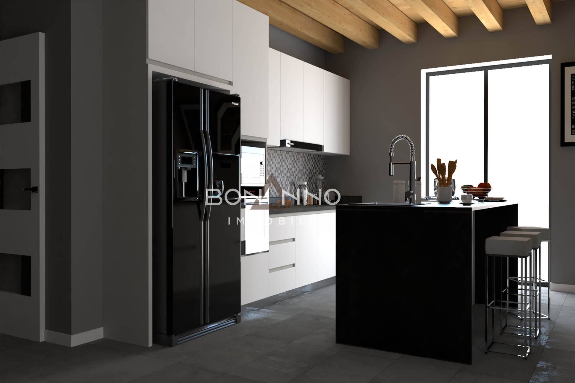 The main entrance on the ground floor leads to a large and bright living area where we find the kitchen and living room, a bathroom with window and a laundry room.